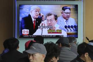 People watch a TV screen showing images of North Korea, South Korea and the U.S. leader in South Korea. (Ahn Young-joon/AP)