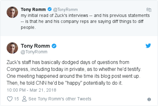 -- Facebook CEO Mark Zuckerberg made his first comments since the story broke last weekend that Cambridge Analytica got access to information on 50 million users. Elizabeth Dwoskin reports: “In a post on his personal Facebook page, Zuckerberg said the company would investigate thousands of apps that used large amounts of data at the time. He said that Facebook will give users easier access to tools to manage how their data is being used and shared, and will further restrict developers' access to data to prevent abuse. … Later Wednesday, Zuckerberg went on a small media tour to elaborate on his views, telling CNN he would consider testifying before Congress about the problems.”