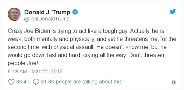 The president went after his potential 2020 opponent Joe Biden, who recently reiterated his desire to beat Trump up over his treatment of women: