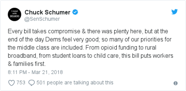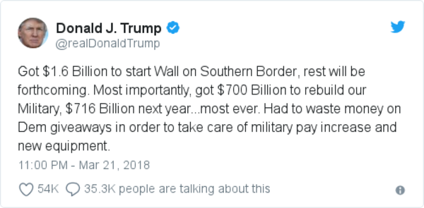 Trump nearly derailed the whole package yesterday because there was not more wall funding, but he relented after Paul Ryan paid an emergency visit to the White House residence. Mitch McConnell dialed in and was on speakerphone. “They argued that he was getting money for the border wall at a level the White House had been signaling was acceptable,” per Robert Costa and Josh Dawsey. “In recent days, he has insisted to associates that congressional Republicans ‘owe’ him more money for the wall since he has raised them millions for their reelection bids and signed the GOP-authored tax bill into law. Tuesday’s dinner gala for the National Republican Congressional Committee — the $32 million that event raised for House lawmakers, in particular — was on the president’s mind.”