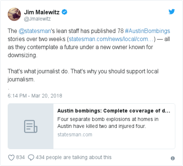 A reporter for Bridge Magazine expressed gratitude for the Austin bombing coverage:
