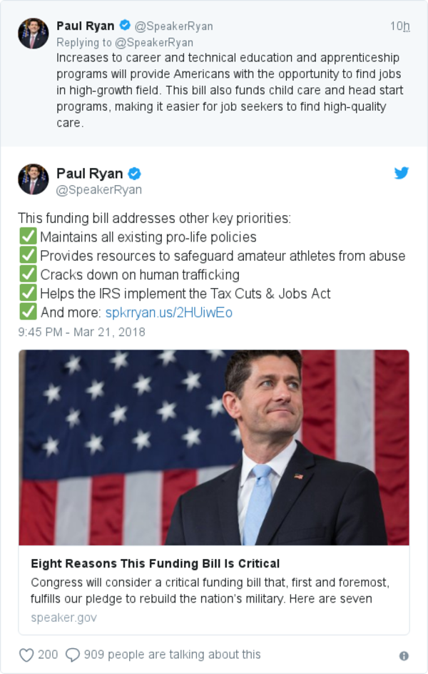 “These job-creating, life-saving investments stand in sharp contrast to the Trump Budget,” House Minority Leader Nancy Pelosi said in a statement. The Speaker: