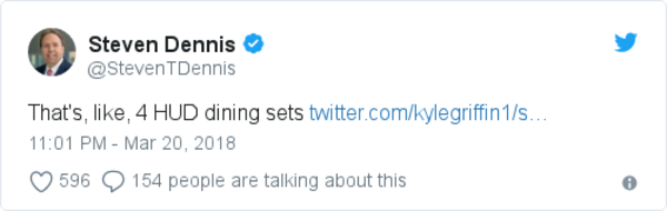 “GOP Rep: The ‘Deep State’ is Responsible for Ordering Ben Carson’s Dining Set,” from the Daily Beast: “Rep. Claudia Tenney (R-NY) appeared to blame the nefarious ‘Deep State’ for ordering a costly dining set for [HUD secretary] Ben Carson. During a recent appearance on [an] upstate New York local radio show, the New York Republican was asked about the decision to buy a $31,000 dining room set for Carson’s office last year. Tenney told the hosts that the ‘Ben Carson story is so misunderstood’ before pointing to a no-named staffer of cryptic origin as the culprit.” “Somebody in the Deep State, it was not one of his people apparently, ordered a table, like a conference room table or whatever it was for a room,” Tenney continued. “And that’s what the cost was …”