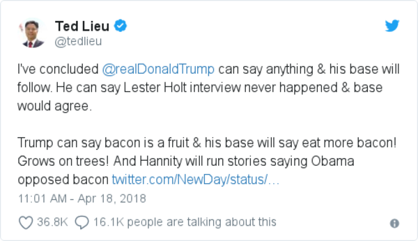 Rep. Ted Lieu (D-Calif.) responded to Trump's claim he did not fire James Comey over the Russia investigation: