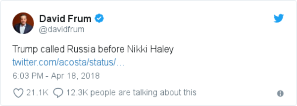 -- U.N. Ambassador Nikki Haley told reporters in New York her working relationship with the president is “perfect.” From Politico’s Eliana Johnson and Burgess Everett: “But the sanctions episode is a stark reminder that this president has little compunction about letting his top staffers and appointees dangle. As the White House scrambled to explain the president’s change of heart on issuing Russia sanctions, Haley became a convenient target for West Wing aides working to smooth a ragged decision making process without blaming the president himself.”