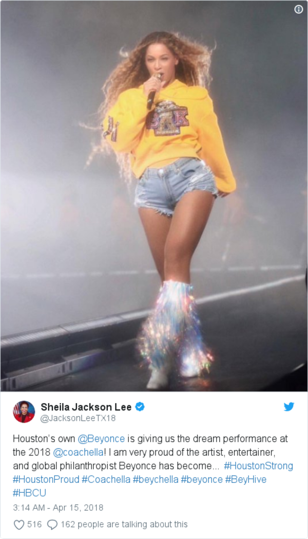 A House Democrat representing Houston celebrated Beyonce's performance at Coachella: