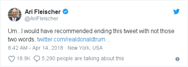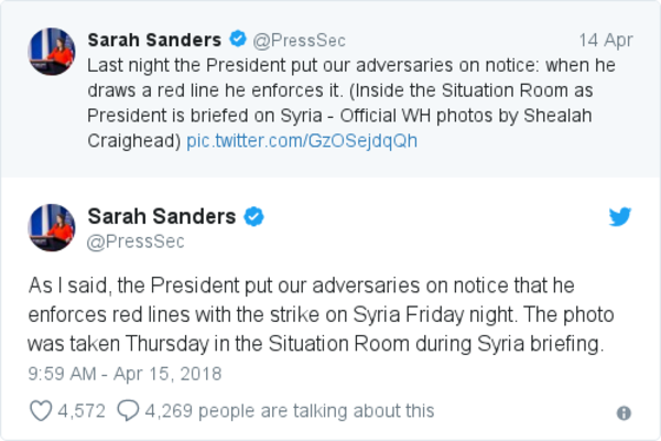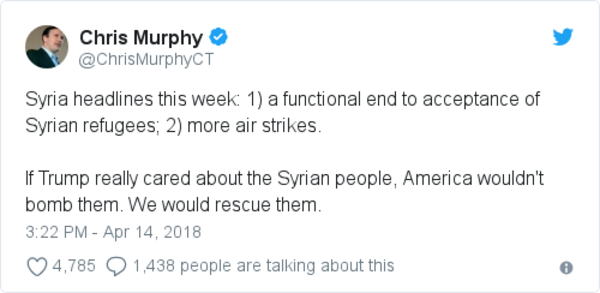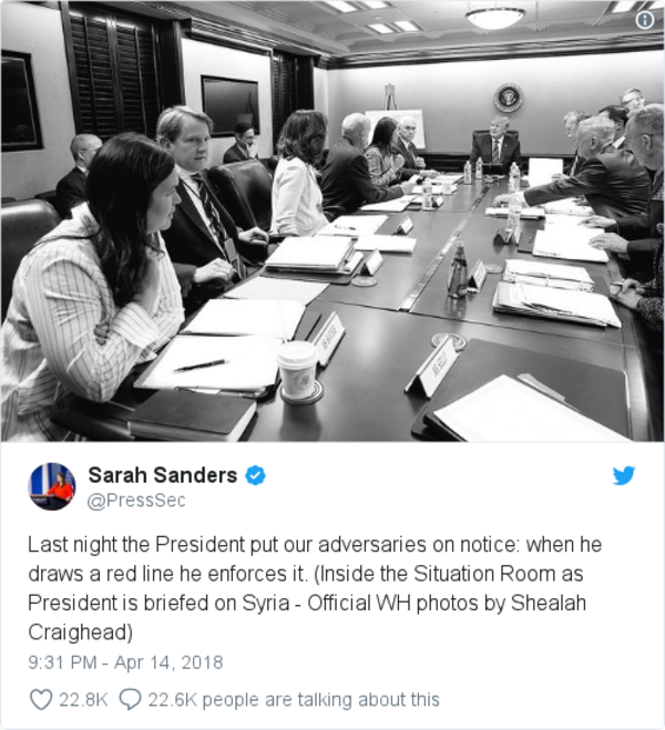 -- Mission accomplished? Syria’s government unleashed a new round of airstrikes on Sunday and shelled civilian homes on residents where the alleged chemical attack occurred. The Wall Street Journal’s Sune Engel Rasmussen and Raja Abdulrahim report: “Mr. Assad’s forces [moved] against areas north of Damascus outside regime control. Regime planes conducted at least 28 strikes in the countryside of Homs and Hama followed by artillery shelling … On Saturday, the regime took full control of Douma, the scene of the suspected chemical-weapons attack and the last rebel-held pocket of Eastern Ghouta, which had been under siege for five years.”