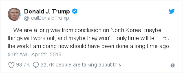 -- Trump administration officials said Kim Jong Un must take significant steps to dismantle his nuclear arsenal before the president will start to lift economic sanctions. The Wall Street Journal’s Michael R. Gordon, Jonathan Cheng and Michael C. Bender report: “Those two closely related questions — the pace of Pyongyang’s nuclear dismantlement and the timetable for sanctions relief — stand to be the major issues of the summit. … In a meeting in Pyongyang over the Easter weekend, Mr. Kim tried to push Central Intelligence Agency Director Mike Pompeo toward a phased agreement in which each side would make paired concessions on a timetable that could stretch out for years, according to a person familiar with the matter. But the Trump administration is wary of making economic and diplomatic concessions upfront for steps to dismantle the North Korean arsenal that would only to be taken later. The administration favors what one person called a ‘big bang’ approach, in which major concessions would be made by each side early on.”