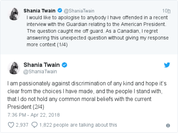 “Shania Twain Says She Would Have Voted For Trump In 2016,” from the Daily Caller: “Country star Shania Twain is Canadian, but if she had been allowed to vote in America’s 2016 elections, her choice would have been Donald Trump. The singer expressed as much during a wide-ranging interview with The Guardian published Sunday. ... [A]s it often does, politics came up, and Twain made it clear she would rather have hers be ‘honest’ instead of ‘polite.’ ‘I would have voted for [Trump] because, even though he was offensive, he seemed honest,’ Twain told The Guardian. ‘Do you want straight or polite? Not that you shouldn’t be able to have both. If I were voting, I just don’t want bullshit. I would have voted for a feeling that it was transparent. And politics has a reputation of not being that, right?’” |