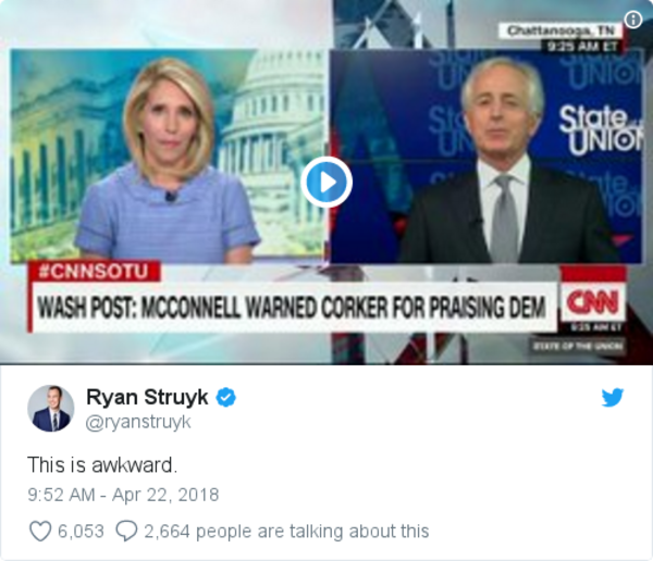 -- Outgoing Sen. Bob Corker (R-Tenn.) reiterated during an awkward interview on CNN that he will not campaign against the Democratic nominee vying for his seat. Weigel reports that Corker accused the NRSC of leaking “news of tensions with [Mitch McConnell] over Corker’s public comments about former governor Phil Bredesen, the likely Democratic nominee, and his advantages in the race. 'Look, I have sent the maximum contribution to the Republican nominee on our side. I have said I’m going to plan to vote for this person,' Corker said. 'I was in a long meeting where … they were asking me about Governor Bredesen. He is my friend. I am not going to campaign against him, but I am supporting our nominee.'" (He appeared eager to avoid saying Marsha Blackburn's name.)