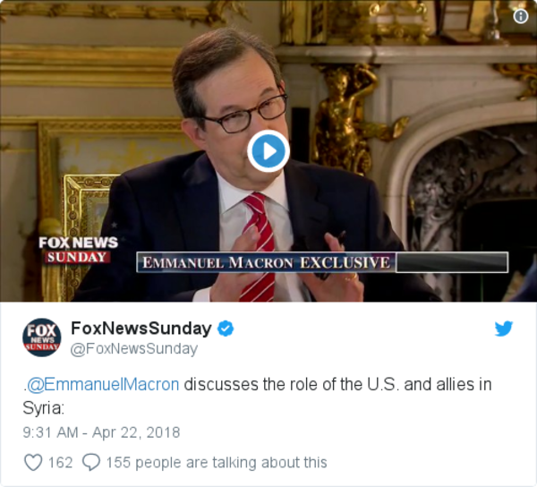 On Fox, Macron reiterated the imperative of a U.S. presence in Syria. He said regime change would “fuel the new terrorists” and create a power vacuum that the “Iranian regime” will fill. “It’s not automatically U.S. forces, but that’s U.S. diplomacy and that’s your presence,” Macron said. “We will have to build a new Syria after war, and that’s why I think the U.S. role is very important to play.”