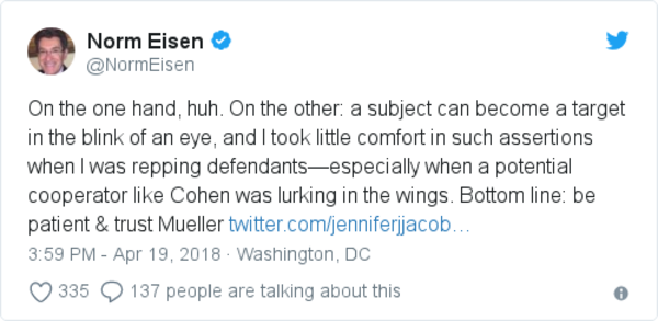Obama’s former White House ethics czar commented on Rosenstein's reported reassurance to Trump that he is not a target of the Mueller probe: