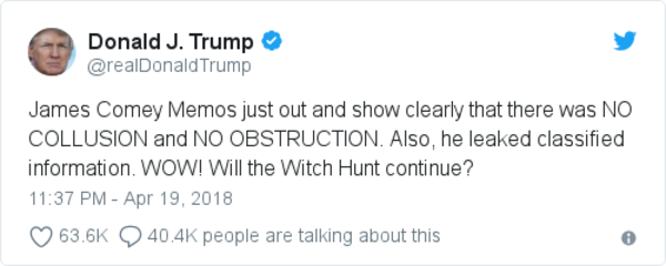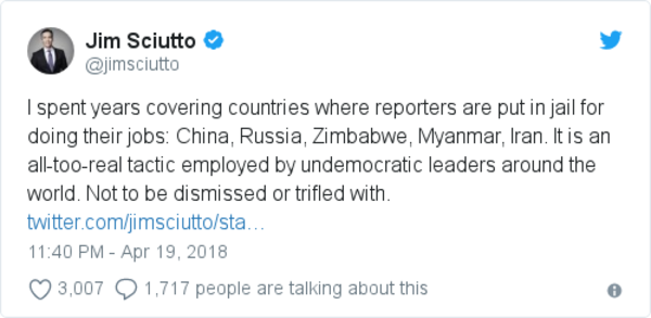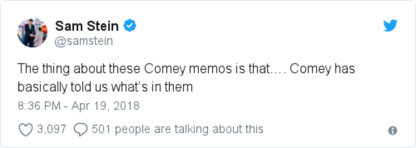 - “Comey’s memo of his Feb. 14, 2017, discussion with Trump also includes a previously unreported exchange about trying to prevent leaks. … [Trump said stopping leaks] may involve putting reporters in jail. ‘They spend a couple days in jail, make a new friend, they are ready to talk.’”