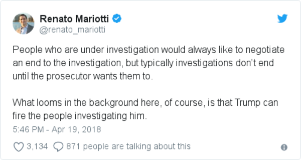 -- Michael Cohen has withdrawn his libel lawsuit against BuzzFeed and Fusion GPS over the infamous dossier, which suggested Cohen helped facilitate Russian interference into the 2016 election. Rosalind S. Helderman and John Wagner report: “[The lawsuits] would have required Cohen to submit to an evidence discovery process, forcing him to produce documentation and sworn testimony about his activities … Among other things, the dossier alleged that Cohen had traveled to Prague and met with Russian operatives. Cohen filed a pair of lawsuits in January … claiming he could prove that the allegation was false and had harmed his reputation. In a statement, Cohen’s lawyer said he continues to deny the allegations but had to concentrate on other legal matters after [last week’s FBI raid].”