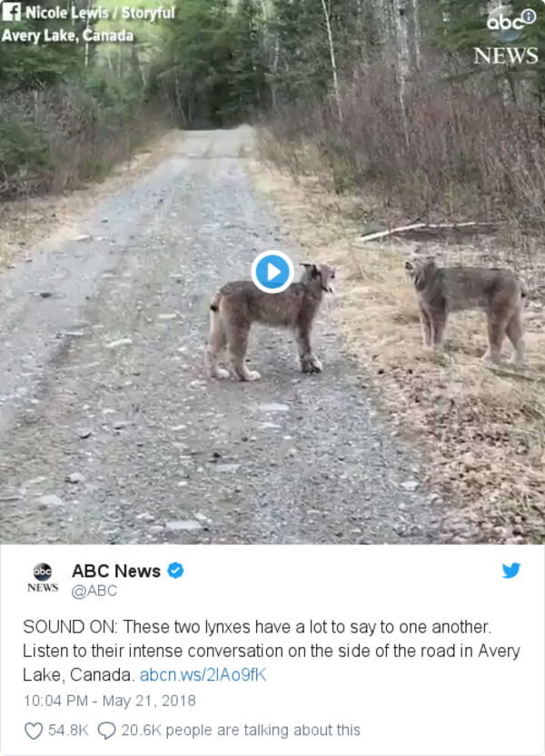 Turn the sound on for what is a confusing but relatable exchange between two lynxes: