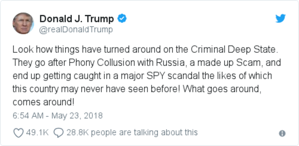 -- Just two Republican lawmakers will be allowed to review classified information at the Justice Department on Thursday about FBI source Stefan Halper, who aided the investigation into the Trump campaign. Karoun Demirjian and Matt Zapotosky report: “Press secretary Sarah Huckabee Sanders announced at a White House press briefing that House Intelligence Committee Chairman Devin Nunes (R-Calif.) and House Oversight Committee Chairman Trey Gowdy (R-S.C.) would be the only two lawmakers at the meeting, which would also include FBI Director Christopher A. Wray, Director of National Intelligence Daniel Coats and Principal Associate Deputy Attorney General Ed O’Callaghan. Sanders said no White House officials would attend, even though Chief of Staff John F. Kelly brokered the gathering. She said Democrats were cut out because they had not requested the same materials that their Republican colleagues had.”