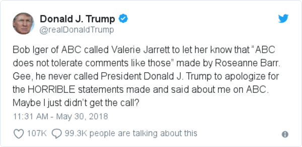 By “vj,” the star of “Roseanne” meant former Barack Obama adviser Valerie Jarrett. The reference to Jarrett, who is black, was clearly racist. Barr apologized, but ABC canceled her hit show. President Trump has thoughts about the show's cancellation, and they're pretty consistent with what he's said (or hasn't said) in the past about condemning racism.