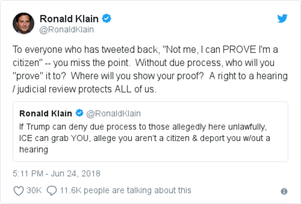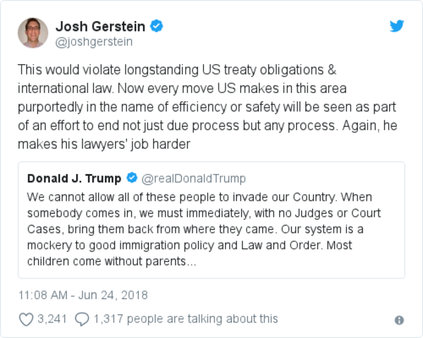 -- The president explicitly advocated for depriving immigrants of their due process rights, tweeting that anyone who crosses the border illegally is an “invader” who should be deported without getting to appear before a court. Philip Rucker and David Weigel report: “Trump’s attack on the judicial system sowed more confusion as lawmakers struggle to reach consensus on immigration legislation and as federal agencies scramble to reunite thousands of migrant children and their parents [after Trump’s abrupt policy reversal last week]. ‘We cannot allow all of these people to invade our Country,’ Trump wrote. ‘When somebody comes in, we must immediately, with no Judges or Court Cases, bring them back from where they came.'”