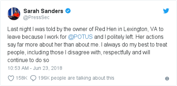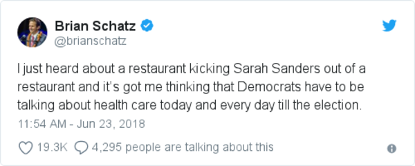 The White House’s eagerness to talk publicly about what happened shows that they see Sanders getting 86’d from a 26-seat restaurant as a winning issue that they can play to their advantage. Happy to keep the story alive, the president tweeted this Monday morning: