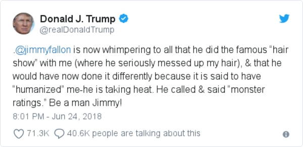 Trump also appeared to respond to Jimmy Fallon's recent comment that he “made a mistake” by inviting Trump on “The Tonight Show” during the 2016 presidential campaign: