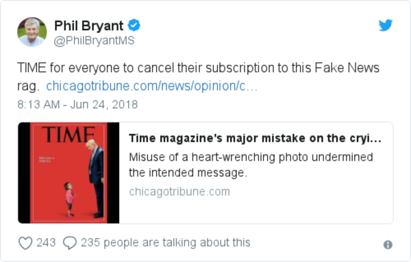 Mississippi's GOP governor called for boycotting Time magazine because the migrant girl featured on its cover was not actually separated from her mother at the border: