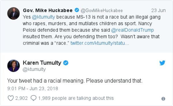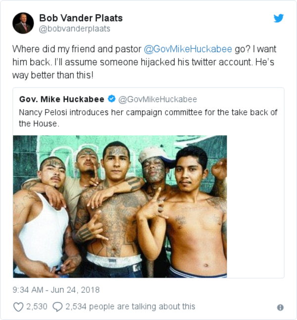 Many pushed back on Mike Huckabee, the former Arkansas governor and father of the White House press secretary, for posting a picture of MS-13 gang members and describing them as Nancy Pelosi's campaign committee to retake the House. From the president of the Family Leader, a social conservative organization in Iowa that was key to Huckabee's 2008 victory in the caucuses: