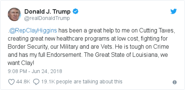 Trump reiterated his support for Rep. Clay Higgins (La.) in his GOP primary, pitting the president against his lawyer Rudy Giuliani, who is backing Higgins's opponent: